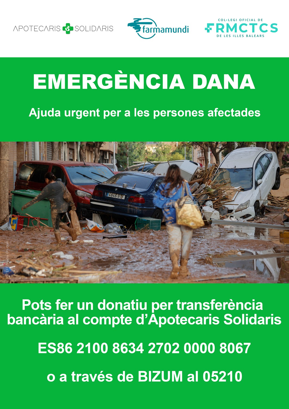 Davant la terrible catàstrofe succeïda aquests dies al nostre país, les ONG Apotecaris Solidaris i Farmamundi, amb la col·laboració del Col·legi Oficial de Farmacèutics de les Illes Balears, posen en marxa una campanya urgent de recaptació de fons per a les persones afectades per la recent DANA.