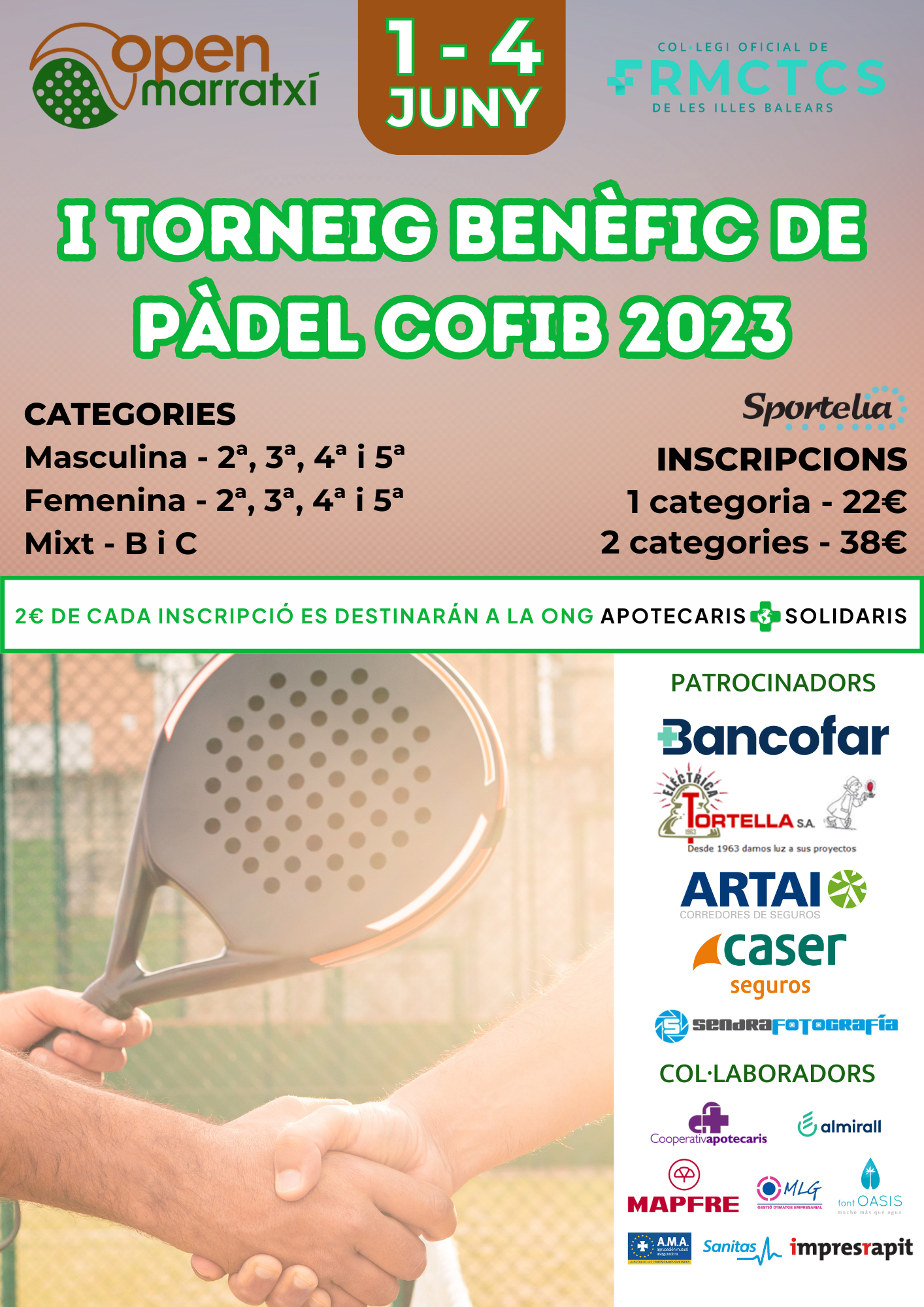 Els propers dies 1, 2, 3 i 4 de juny el Col·legi Oficial de Farmacèutics de les Illes Balears organitzarà la primera edició del Torneig benèfic de Pàdel 2023, a benefici de l’ONG Apotecaris Solidaris. Les inscripcions per al torneig seran obertes tant per a col·legiats del COFIB com per a aficionats en general i se celebraran a les pistes de l’Open Marratxí. A més de premis per campions i finalistes s’entregaran packs de benvinguda i inclourà jocs infantils durant el matí del diumenge 4 de juny.